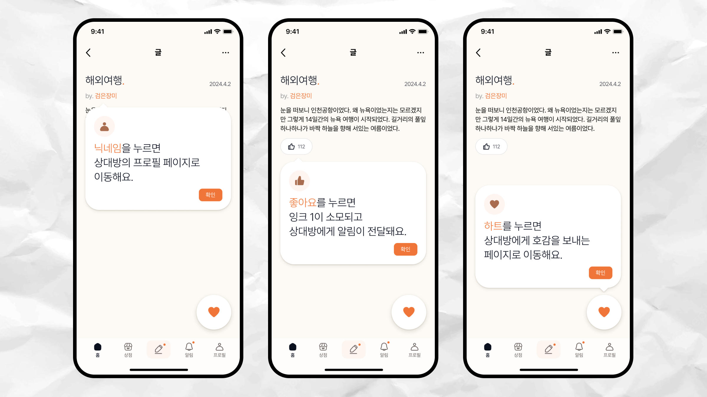 write은 글쓰기와 데이팅의 만남이 이루어진 앱이다 보니 처음 사용하시는 분들은 다소 생소할 수 있을 거라고 생각합니다. 하지만 1.0 버전에서는 이런 부분을 세심히 챙기지 못했어요. 이번 1.1 버전에서는 사용자가 가입 후 첫 번째 만나는 상대방의 글에서 각 버튼의 용도를 설명하는 매뉴얼 툴팁을 노출합니다. 이제 빠르고 직관적으로 write의 사용법을 배우실 수 있어요.