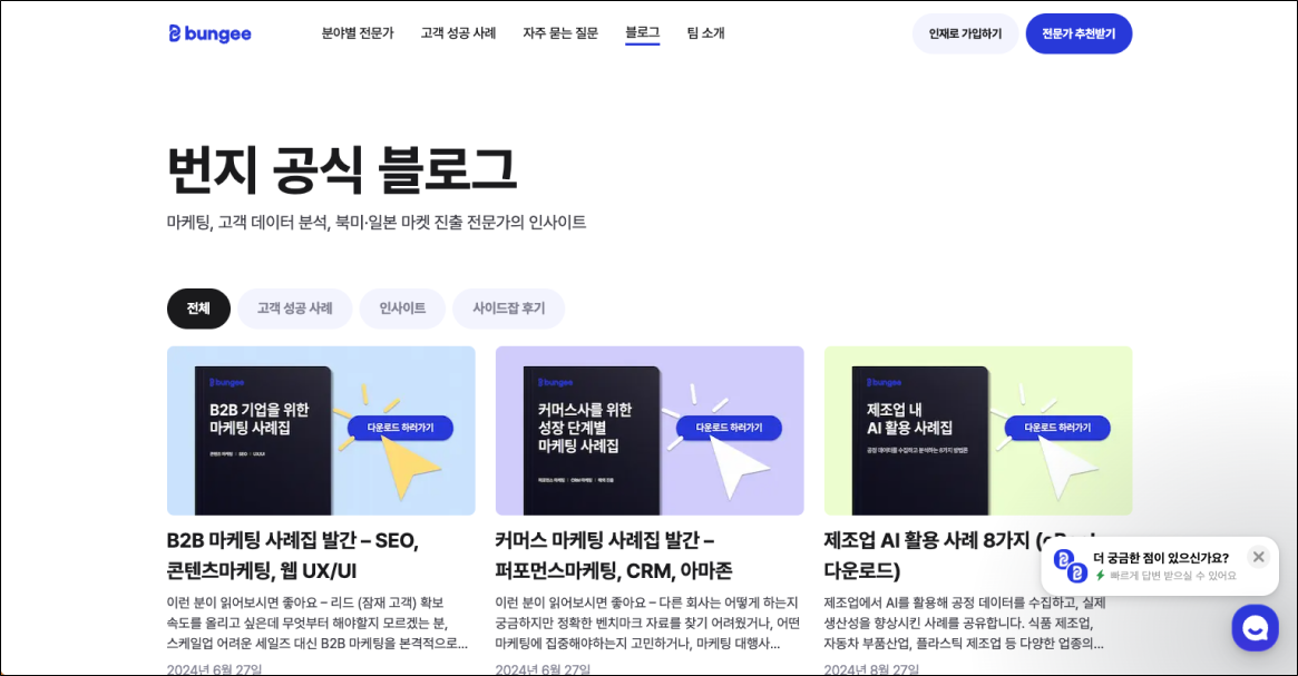 번지는 최근 늘어나고 있는 프리랜서와 기업을 연결해 주는 플랫폼입니다. 다만 2024년 6월에 엄청나게 많은 글을 작성하고 지금은 신규 글이 거의 없는 상태인데요. B2B2C 서비스답게 기업 측의 성공 사례와 프리랜서 측의 사이드잡 후기가 모두 있는 것이 특이점입니다. 더불어 마케팅, 개발, 디자인 등 다양한 실무 인사이트와 사례집도 찾아볼 수 있습니다.