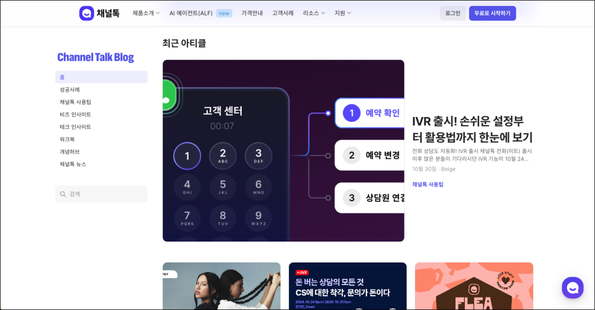 채널만큼이나 국내 B2B SaaS의 대표격 기업인 플렉스 역시 알차게 블로그를 운영하고 있는데요. 역시 고객 사례는 빠지지 않고 들어가 있으며 플렉스 업데이트 노트, 플렉스 팀의 이야기, 인사이트 등 카테고리의 구성은 채널톡과 비슷한 모습을 보이고 있습니다. 다만 주제가 HR에 훨씬 집중되어 있고 썸네일이 채널톡과 비교하면 정제되고 심플한 느낌이 강하네요.