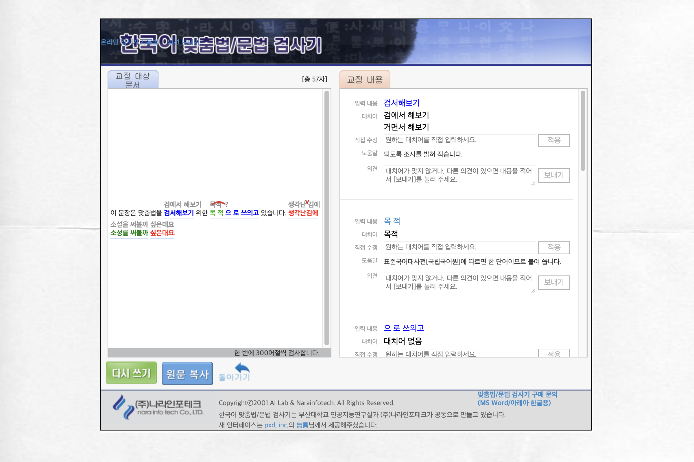 ‘부산대 맞춤법 검사기’로 불리는 이 검사기는 부산대학교 인공지능연구실과 나라인포테크가 공동으로 제작하는 맞춤법 검사기입니다. 이 검사기는 꼼꼼하고 디테일한 검사 결과를 내는 것으로 유명한데요. 일단 제가 사용한 테스트 문장에서는 네이버 검사기에 비해 두 부분 정도를 원래 의도대로 교정하지 못하는 모습을 보였습니다. 물론 이 부분은 문장마다 차이가 있을 수 있으며 네이버 검사기는 추측이 필요한 ‘소설’이라는 단어를 수정하지 못했지만 부산대 검사기는 교정한 것을 보아 검사기마다 로직의 차이가 있는 것을 알 수 있었습니다.