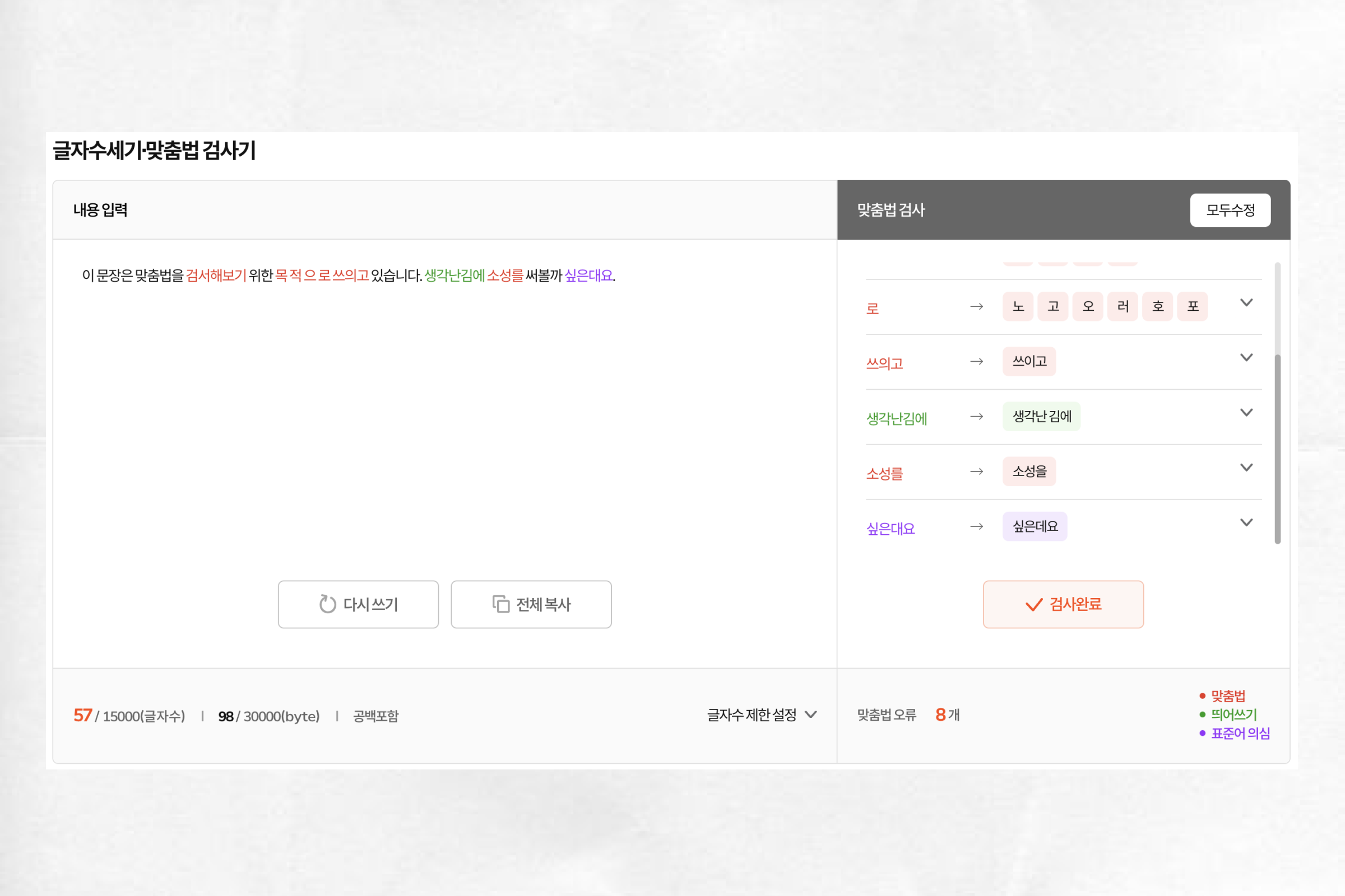 취업 포털들도 맞춤법 검사기를 제공하고 있는 경우가 많은데요. 그중에서도 대표적으로 인크루트의 맞춤법 검사기를 사용해 봤습니다. 인크루트 검사기는 네이버 검사기와 비슷하게 맞춤법, 띄어쓰기, 표준어 의심의 세 가지 문항으로 맞춤법 교정 결과를 보여줍니다. 글자 수를 한 번에 15,000자까지 넣을 수 있고 각각의 교정 항목에 대해서 선택지를 제공해서 사용자가 직접 선택할 수 있게 되어있는 점이 인상적입니다. UX의 편의성은 높은 편이지만 인크루트 검사기 역시 두 부분 정도는 원래 의도대로 교정하지 못하는 모습을 보여 결과물의 만족도는 다소 아쉬웠습니다.