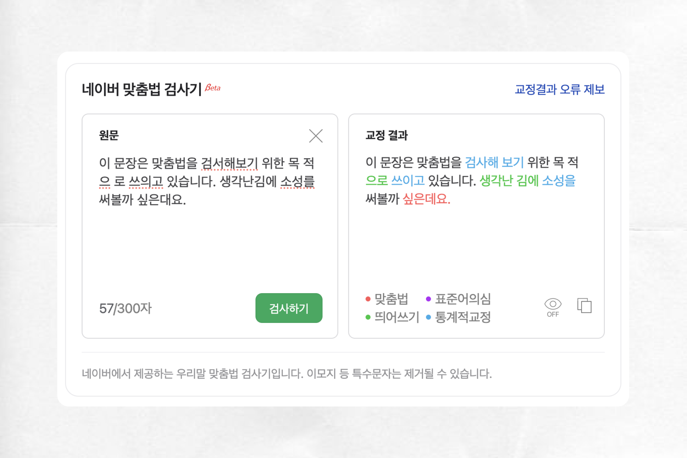 여전히 대한민국에서 가장 많은 사람들이 쓰는 포털 사이트 중 하나인 네이버의 맞춤법 검사기는 맞춤법, 표준어 의심, 띄어쓰기, 통계적 교정의 총 네 가지 문항으로 맞춤법 교정 결과를 보여줍니다. 최대 300자까지 한 번에 점검할 수 있는 적은 글자 수가 아쉽긴 하지만 결과물은 맥락상 추측이 필요한 단어 하나 정도를 제외하고는 대부분 교정된 모습입니다.