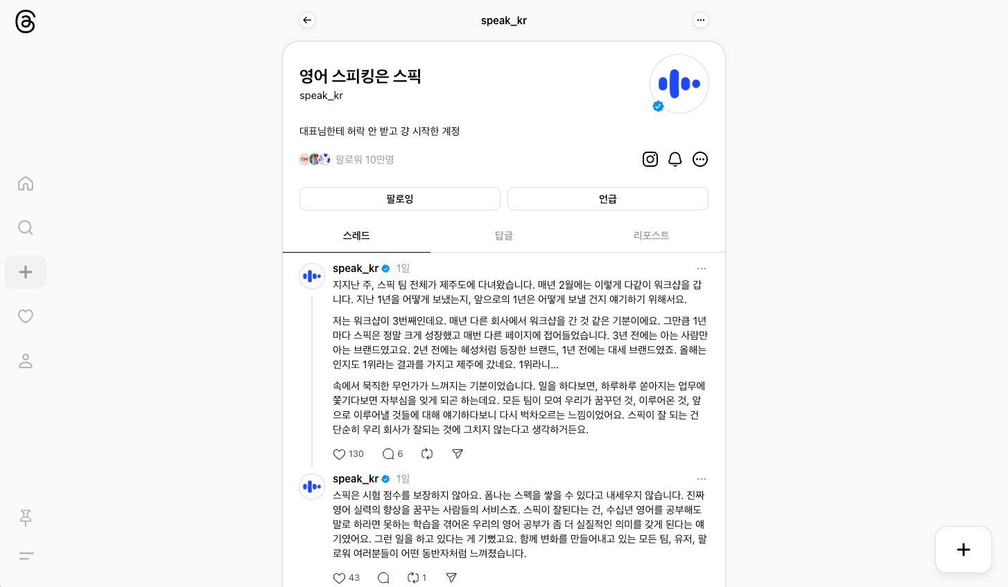 대표님이 미국분이셔서 제가 스레드에 쓰는 모든 글을 100% 이해하진 못하실거예요. 그래도 대표님이 저와 저희 팀에 대한 신뢰가 있어요. 스픽의 브랜드 메시지와 어긋나는 글은 쓰지 않을 거라는, 그리고 잘 할 거라는 신뢰가 있어서 가능했고 지금도 가능한 것 같습니다.