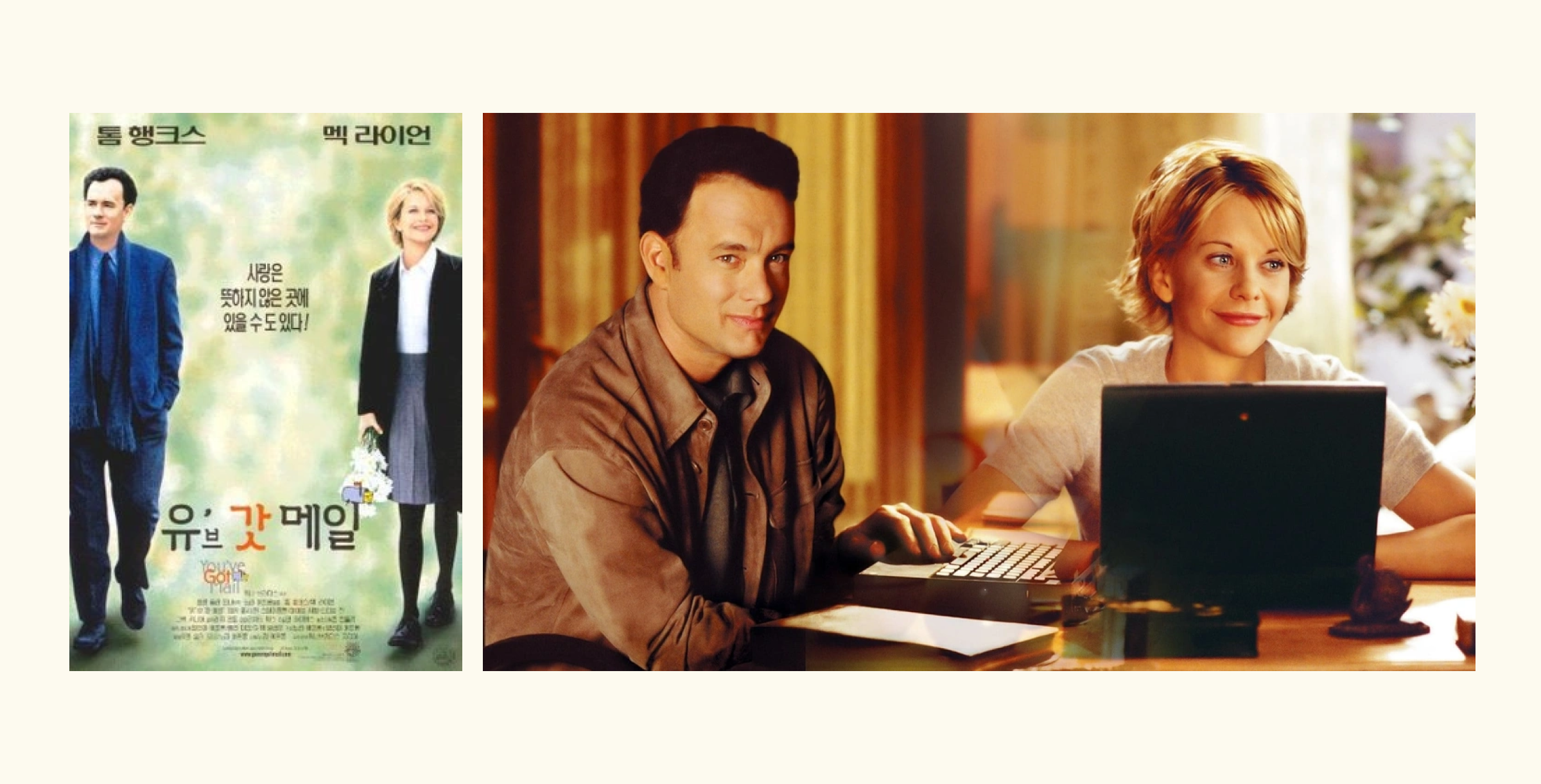 관람: 쿠팡플레이(대여)지금은 화상채팅이 당연한 시대가 되었지만 예전에는 텍스트만으로 서로를 알아가야 했어요. 무려 25년도 더 지난 영화, <유브 갓 메일>은 당시 주가를 올리고 있던 톰 행크스와 멕 라이언 주연의 로맨스 영화입니다. 두 사람은 가까운 곳에 살지만 그 사실을 모른 체 메일을 주고받으며 사랑을 키워간다는 내용인데요. 한때는 메일이 이런 로맨틱한 도구로도 쓰였다는 사실이 새삼 놀랍네요.